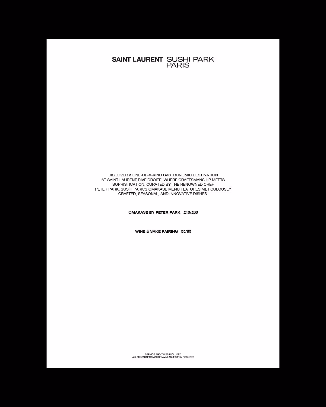 The project also included the design of the menu card, emphasizing refined simplicity, craftsmanship, and the balance between Saint Laurent Rive Droite’s understated elegance and Sushi Park’s authentic spirit. Development of the collaboration logo. Sushi Park logo is custom hand-drawn lettering, and design of the menu card.