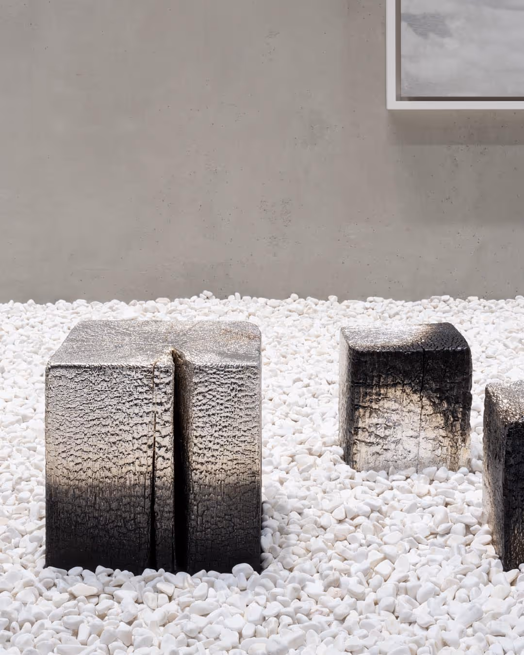 Miya Ando’s art bridges Eastern and Western cultures through depictions of natural phenomena and the passage of time. Spaces with white pebbles were created to accompany and evoke the theme of impermanence and transformation.